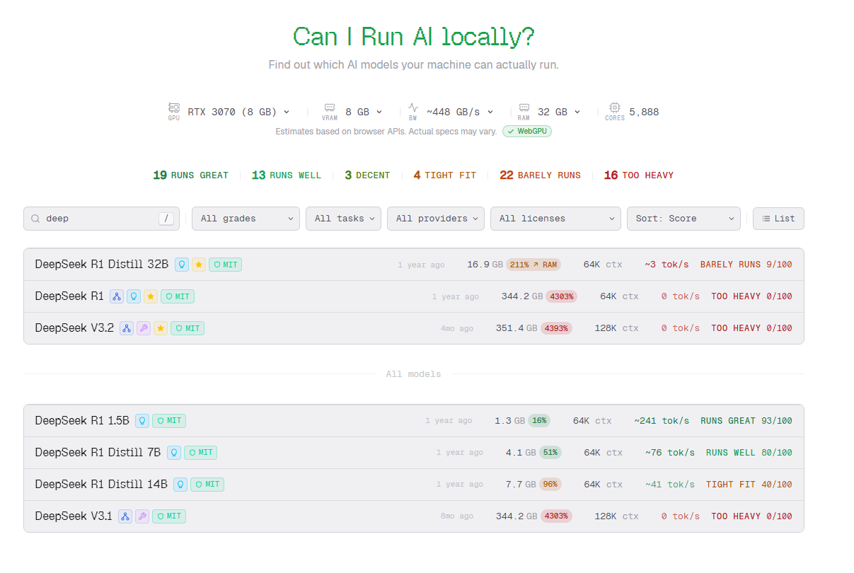 它能自动识别你电脑的 GPU、显存等硬件信息,然后用不同颜色标注出哪些模型可以流畅运行(绿色)、哪些运行吃力(红色),还会显示模型的运行速度(如每秒多少 token),帮助你快速了解自己的设备能驾驭哪些 AI 模型,比如小编的电脑,用 RTX 3070 跑 DeepSeek 7B 模型很轻松,但跑 32B 的模型就会很吃力。